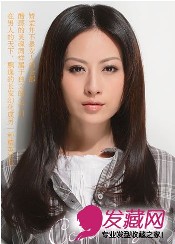 直发干练的精髓很好地得到了诠释。用中分替代侧分,可以令整个发型气质更加中性化。首先用直板夹令整体发片更加服帖,营造出流畅的直线发丝效果。然后在底部发梢部分,加入些许内卷,柔化过于硬朗的发型轮廓,同时令发型重心向下偏移。整款发型十分强调线条感,没有过多修饰,非常适合工作时的OL们。