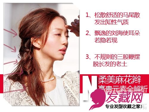 侧梳的发屡,不规则的三股鞭简单柔美,慵懒随性的垂坠在肩头。飘逸的刘海稍微盖住耳朵,随风吹散的同时令耳朵若隐若现,散发出优雅知性的气质,高贵得俨然仙子一般灵气,摆脱冗长披肩发的老土。