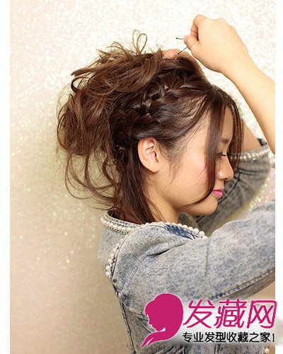 step 3:用黑色小发卡将蓬松的马尾往头顶上固定,最好是多固定一些,这样发型更加稳定。
