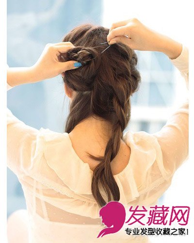 step 2:将两条松散的辫子圈成发髻,用事先准备好的发夹进行固定。