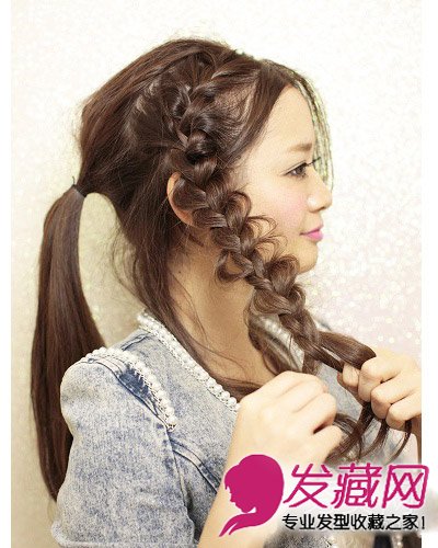 step 1:将头发分成三部分,中间部分扎成马尾辫,两边头发分出小束头发备用,其他头发编成蓬松辫子。