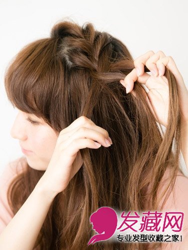 step4:沿着刘海取出头发编成蓬松的辫子。
