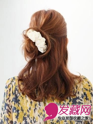 取出头顶的部分头发扭转成花苞后用发圈固定,再将头顶的头发拉扯蓬松。