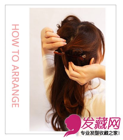 step 2:取右上发束扎成小马尾,注意不要扎太近,留一些空间,可以分开成小孔。