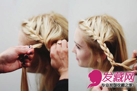 1:从额头左上方头发取三股发束,同时还要从右边取一股新的发束进行编织。编到左耳上方时,再按照编“麻花辫”的方式续接的编,一直编到快到发尾为止。