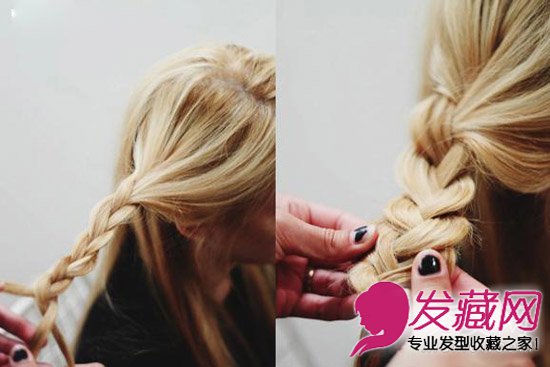 2:接着在从右耳边取三股发束进行编织,之后将辫子拉松散一些。