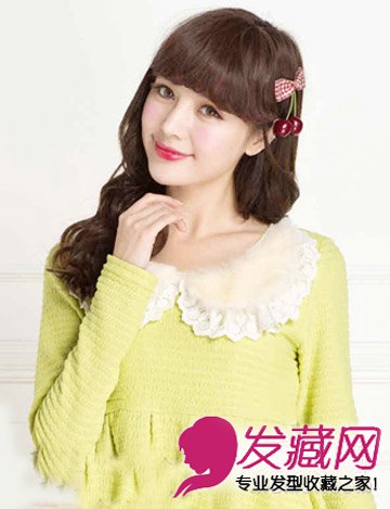 栗色的头发颜色,不仅能给美眉你增添时尚感,还不会显得过分张扬夸张,这款披散的公主烫发,厚重的齐刘海,修颜效果很赞吧,樱桃的发饰,清新又可人哦。