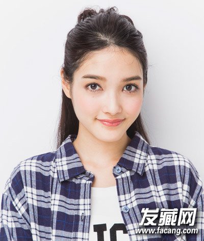 前额的头发绑成略紧的公主头,露出光洁的额头与甜美的妆容。长发自然的垂下,清新甜美。