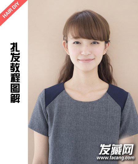 整齐的刘海略带卷翘弧度,修饰脸部线条衬托出明丽的双眼。半扎发披散在肩头甜美清新。