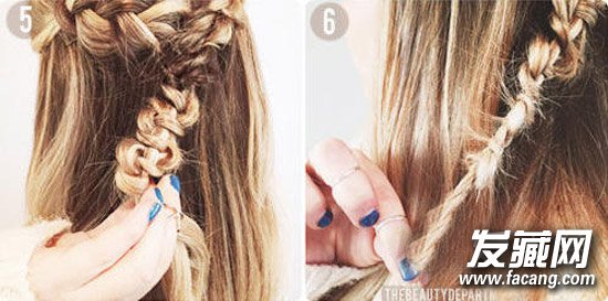 step 3:按照右图所示的样子编发辫。将刚才链接到一起但没有做过处理的头发拿出来,分为三缕,将中间的一缕头发固定不动,两侧的发缕分别缠绕到中间的发缕上。