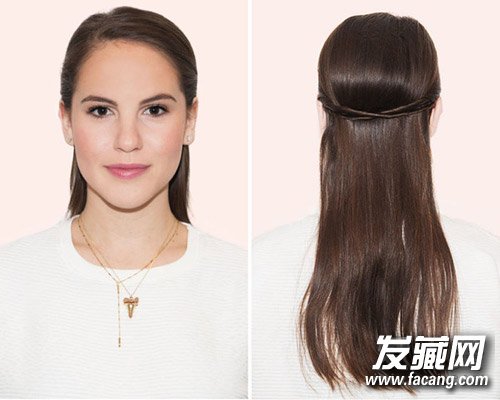 2、两边刘海部分的头发向后缕,两缕头发分别紧紧地扭转到头发的另一边。
