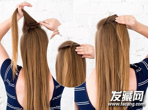 2.把脑袋顶上的头发(除了前面一小绺以外)梳顺,然后用梳子在后面倒着梳两下,这样可以增加厚度。然后卷两圈,用发卡固定好。