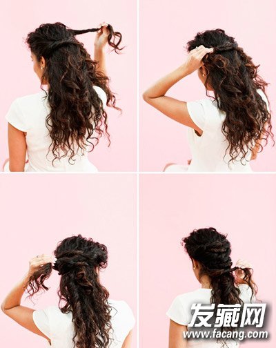 2.在右边相同位置取一缕头发向左卷,并固定。像这样左右来回卷头发直到卷到底部。