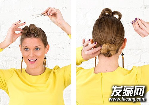 step4:在鼠尾梳的帮助下均匀地收集头发,绑一根整齐的低马尾,可用适量的直发膏来使头发更加整洁。如图绕成一个整齐的低髻,用夹子固定。