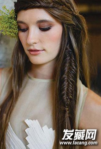 一款波西米亚风编发发型,精致鱼骨辫本身已经很美了,加上公主头和绿色花朵修饰,气质爆表!