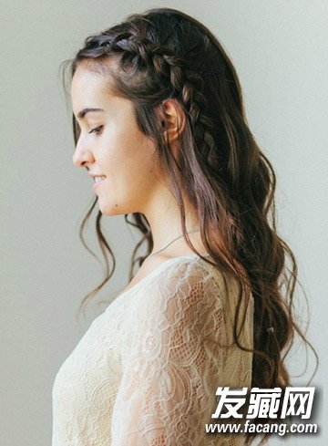 3.将上半部分头发放下,从额前挑出头发编成蜈蚣辫,编的稍凌乱蓬松一些。两边一边一根。
