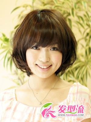 第一眼看这款短发发型,就会觉得是一款相对来说比较甜美的风格!整体具有厚重质感的秀发带来十足的甜美气息,覆盖式的齐刘海有点向左边玩玩的倾斜,看上去非常的自然!从发干处开始打造出一种有点向内弯的卷度与脸颊完美贴合,掩盖了大圆脸的视觉效果,搭配可爱的服饰就很可爱啦!