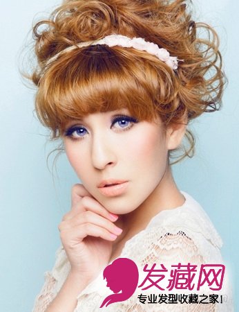 披肩卷发的美眉在夏天不妨将头发束起之后用倒梳和打松的方式让头发若花朵一般绽开在头顶,并用一款俏丽发箍做点缀,头发越蓬松会显得脸更小哦,当然也要保证刘海的完美弧度。