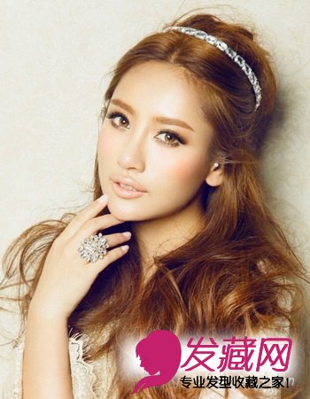 这是一款专门为圆脸设计的发饰,首先将少量头发系于后脑勺,抓出蓬松的花苞造型,最后搭配亮晶晶的发箍,作为吸引目光的亮点,可以让脸型更为修长和立体,同时还能防止发型扁塌没有生气。