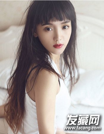 精致的瓜子脸发型一款蓬松的长发烫发发型,唯美的及腰长发发型搭配齐刘海的设计,发尾的发色挑染显露出别致的时尚感来。