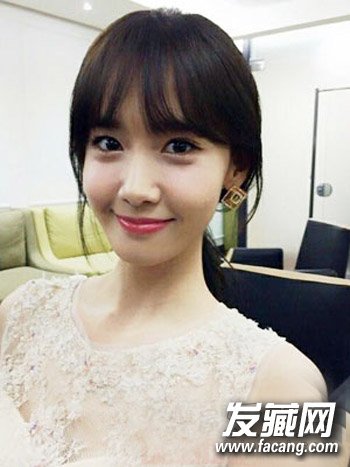 林允儿MM的这款韩式低马尾扎发是韩剧中最常见的女神发型,长发配合棕色系染发很衬肤色,简单的齐刘海发型扎法甜美清新。