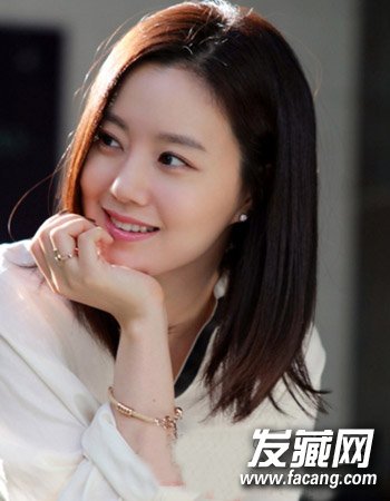 气质的中分与柔顺的中长直发搭配起来,不仅解决了额头宽的问题而且显露出别致的知性范来。