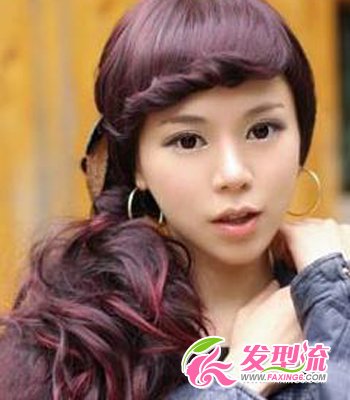 紫色系的染发颜色加上一点的挑染效果,给人一种时尚而神秘的感觉,是这款发型的亮点之一,显得分外有女人味。吹成外卷的刘海更显出挑,有着强烈的立体感,是这款韩式发型的又一亮点。低马尾斜扎发,突显女生的活泼俏皮,别上简约的发饰,展示出都市女性的气质。