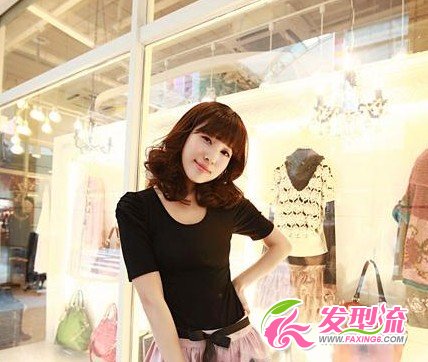 可爱的齐刘海,是女生的最爱,长及眼睛的刘海长度,微微内弧,让脸颊更加的小巧可爱,脸边大大螺旋卷发,包裹住脸颊,突出精致的小脸,更加清纯可爱!