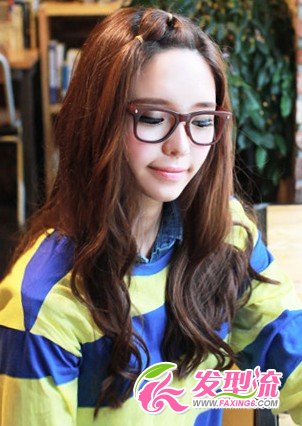 将额前的秀发收拢,编成束发盘在一侧,弯曲的弧度卷发,散放在肩上搭配边框眼镜,呈现出清新的学生味。