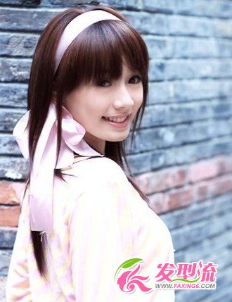 齐刘海营造出灵动的大眼睛和精致的脸颊。飘逸的粉红丝带让韩式发型生动俏皮。发丝随风飘动青春洋溢。
