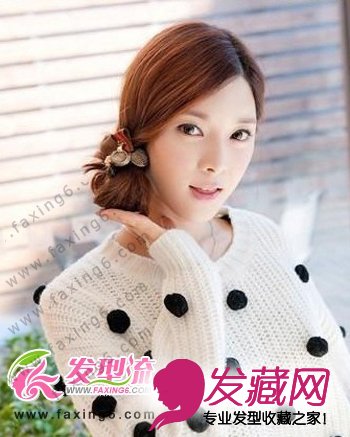 低扎侧发髻,十分的温婉优雅,无刘海的设计让整个发型看上去更加的清爽干净,清新怡人,棕色的染发更显衬托出女孩白皙通透的肌肤,特别引人注目。