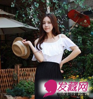 中分长直发发型,秀发收拢放在头发后面,白色露肩衬衫,清爽大气又充满女人的性感诱惑。