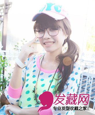 韩式发型扎法,打造出一个清新简洁的侧扎马尾发型,发丝卷曲的效果更突显出女生发型的可爱俏皮感,整齐的平刘海发型修饰着女生的小圆脸,非常的俏皮可人,再搭配上一个流行的鸭舌帽,绝对是一款让人人见人爱的甜美女生发型。