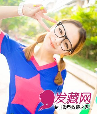 葫芦结双马尾韩式发型扎法,十分的俏皮可爱,两个低扎的葫芦结马尾发型,将女孩甜美可爱的气质展现的淋漓尽致,无刘海的韩式发型扎法,更是清新无比,搭配一副粗边框眼镜,尽显俏皮可爱感。