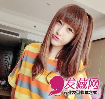 覆盖额头的齐刘海凸显精灵眼睛,可爱俏皮的冲天辫,与直发梨花头搭配清纯又俏皮。浓郁的奶茶色染发更纯真动人!