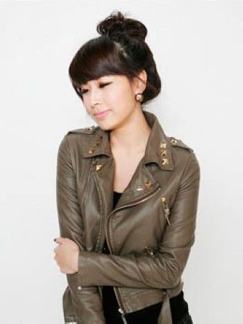 小编点评:花苞头要扎得有女人味。首先刘海最好选择大偏分斜刘海,其次耳饰的选择也是很重要的,相对来说,黑发的花苞头会更淑女一点。