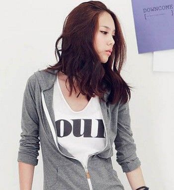 小编点评:前刘海 被固定上去,露出整个额头,似乎日韩两国的MM都喜欢这种发型,还是蛮适合圆脸MM的,巧克力色梨花头不会过于甜腻,和运动风开衫卫衣出奇地配。