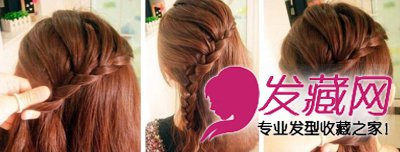步骤二:一直往左边编,不用编得太紧,不然会显得很死板,重点是营造蓬松自然感,编至没有叠加的发束,就往低下开始编,快到发尾处的 时候用皮筋扎好。