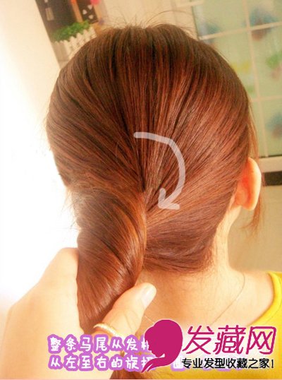 第三步:整条马尾从发根处,从左至右旋扭一圈,如图示。