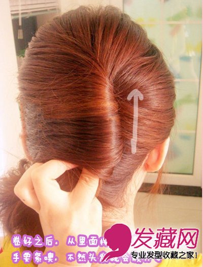 第四步:卷好之后,从里面按住,整体往上推,手要紧哦,不然头发就会散开的。