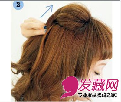 步骤2:把这股发束紧紧扭转至发中后向上推,使头顶瞬间蓬起来。