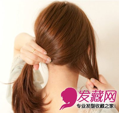 Step1:在刘海倾斜的方向留出一小束头发,耳际后面也留一束头发,其余的头发扎一个低马尾;