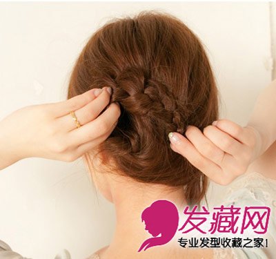 Step4:靠近发根的地方挖出一个洞,将麻花辫发尾塞进洞里,打造一个小的发包,然后用U型卡固定,注意将U型卡和发尾隐藏起来;