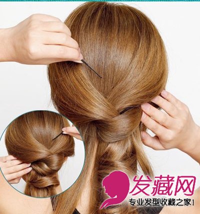 步骤3.将左侧发股向右上方提拉,使用发卡固定。将右侧发股向左上方提拉,用发卡固定。