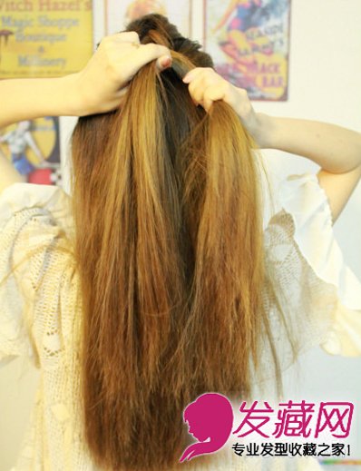 步骤三:上部分先按麻花辫的方法,编入两小节后,便按照蜈蚣辫的编发,每编入一小节都重新加入一束头发。