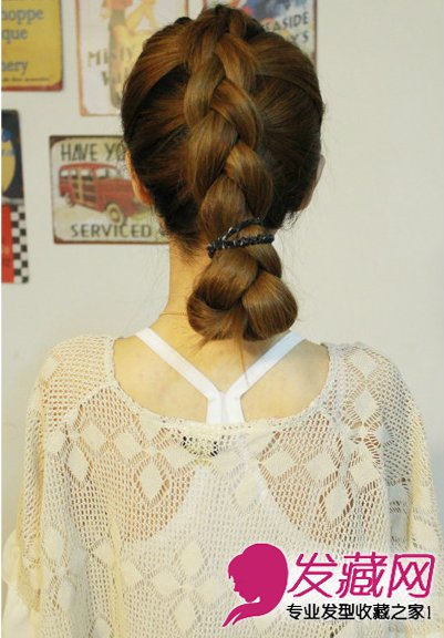 步骤八:如图所示,用皮筋固定上步的头发,刚好扎在里面头发的发根处。