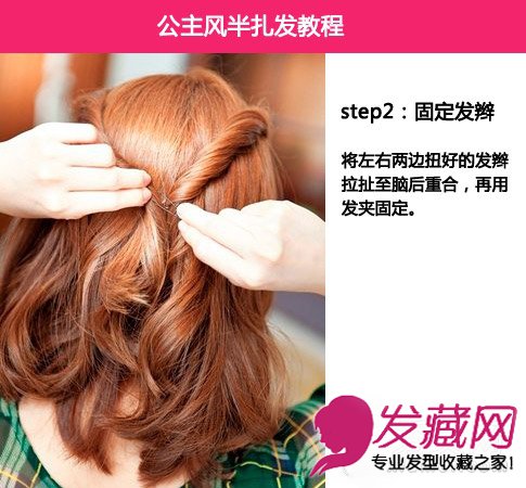 step2:将两束扭转好的发束在脑后重合,再用发夹固定在一起。