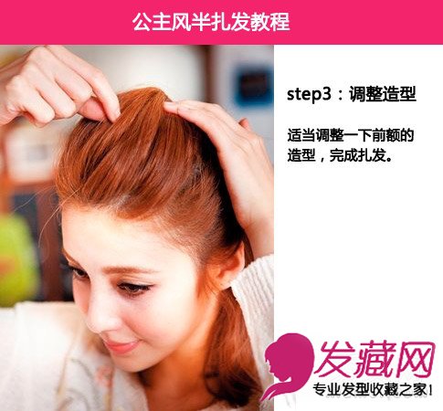 step3:扎发完成后调整前额造型,戴上发饰,完成盘发设计。