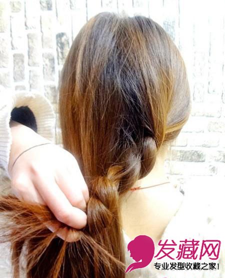 7、先把右边的头发分成两股互相缠绕,像麻绳一样拧在一起。