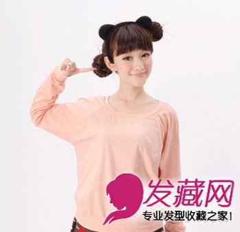 两个丸子头在头上上下位置,显得非常的俏皮可爱,厚重微卷的齐刘海,很好的修饰了脸型,突出了小脸。黑色的发箍,带在头上,从远处看,头上貌似都是球,是一款可爱的少女编发发型哦。